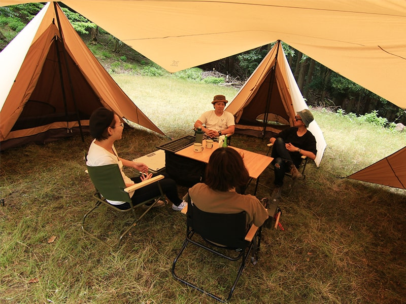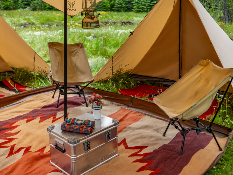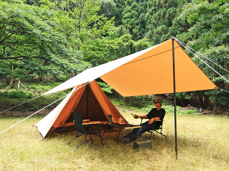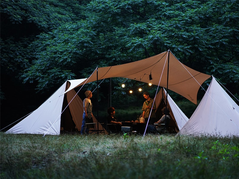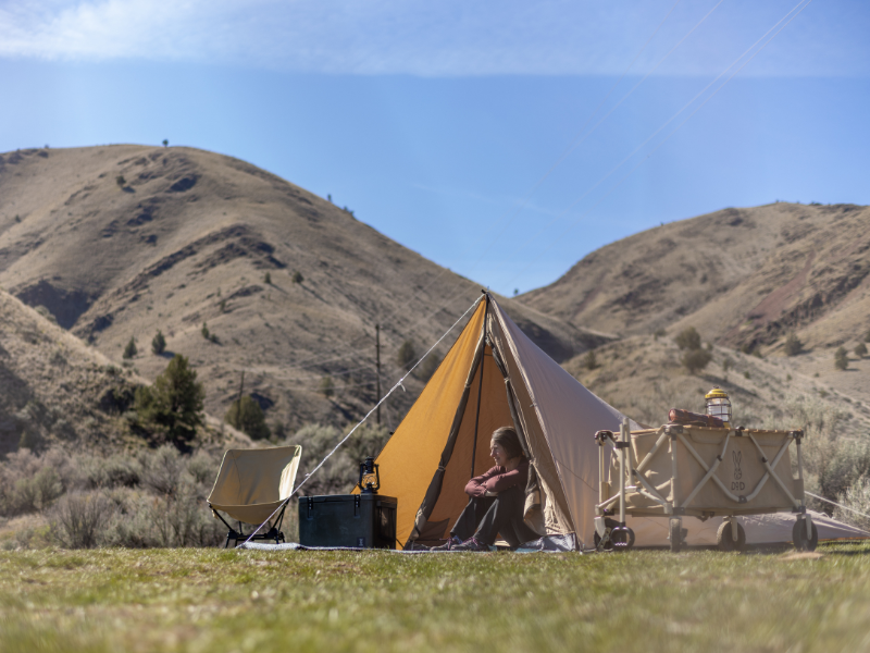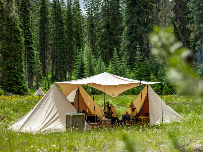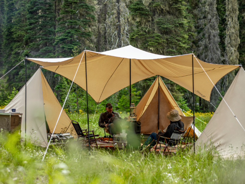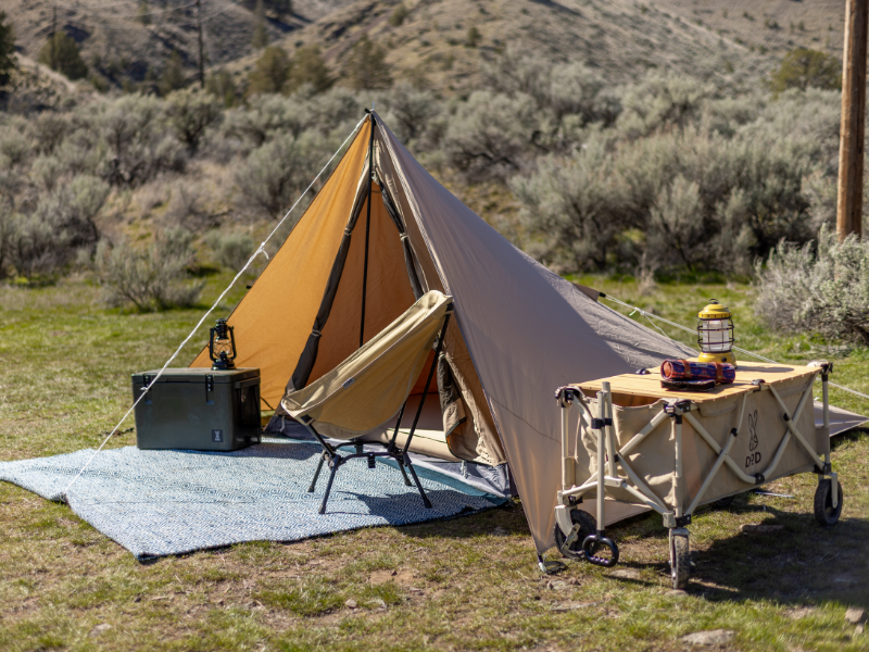The Chimaki Tent is designed for those who like a bit of style in camp. If Ray and Charles Eames went camping, this would be their tent. The Chimaki is a two walled tent, a thick Canvo™ outer tent protects and thinner Canvo™ inner tent with a large mesh or Canvo™ door. The tent sleep two. It’s enough to standup straight inside. Unlike other one pole tent designs, the pole is on the outside of the tent so it doesn’t get in the way. The Chimaki can be used alone or as a component in the stunning Chimaki Village three room shelter.