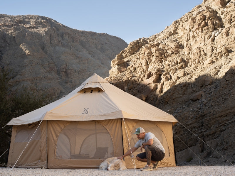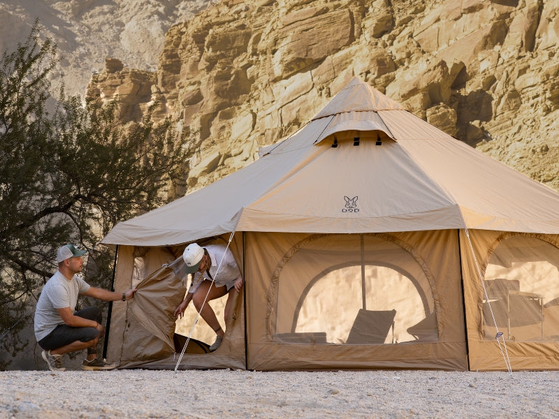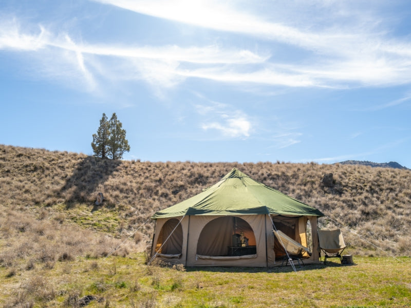 The Takenoko Bell Tent lets you create a glamping experience anywhere you go. The perfect tent for a group to relax, dine, and sleep, all under one versatile roof. Glorious Canvo™ roof allows the tent to breathe so it never gets muggy. All walls convert to mesh or wide open to let in the breeze. The included floor can be taken out to make the tent useful all day, drag a picnic table undercover and don’t worry about muddy boots when you have the floor removed. Install the sleeping chamber(sold separately) to divide the space into two separate rooms for privacy. (Olive available in Spring 2026).