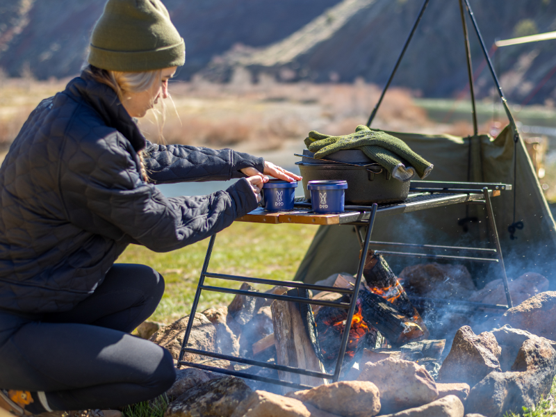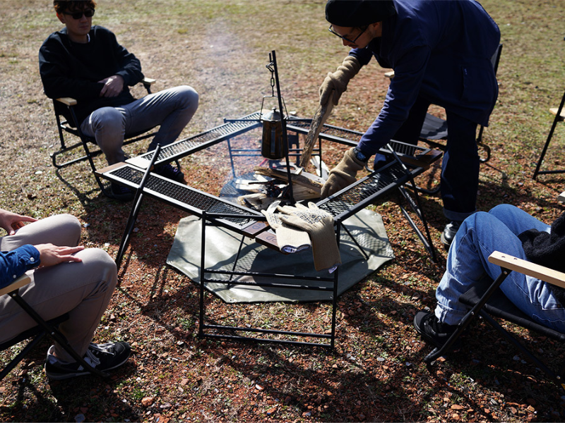 The Tequila Table, available in large (L) and medium (M) sizes, is a durable and versatile camping table. The L size includes three slats for a wider surface, while the M size comes with two. Made from tough iron, it can withstand use over a bonfire and features a special coating resistant to peeling under heat. The table's design allows for various configurations by adding extra plates and legs or using one-by-wood for customization. Its wooden edges provide a comfortable grip, updated to scratch-resistant beech wood for enhanced durability. (For a limited time, comes with custom carry bag).