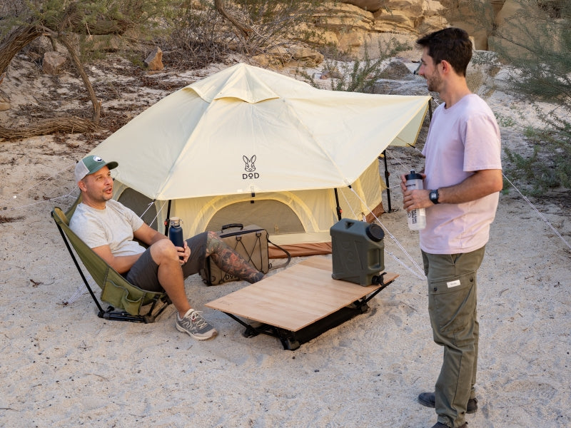 This is our all-purpose tent and the absolute favorite of the DOD team for music festival weekends. The 1Pull design sets up fast with the pull of a string. Vertical walls give you a comfortable feeling of roominess. The hexagonal tent has mesh screens on all sides and the roof, under the rain fly. So the tent is equally good for sleeping at night and hanging out during the day. DOD's 1Pull system allows quick setup and take down. (For a limited time, Green, Teal, and Red variants come with additional Cream rainfly so you can switch up the vibe - Red variant available in Spring 2026).