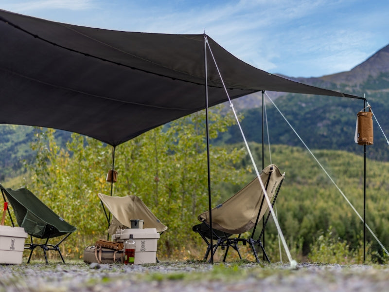 This tarp is really cool looking when set up next to my dak DOD tent. It is made of quality material and includes everything you need to use it right away. It is a little difficult to set-up alone. I would recommend at least two people. Stains show easily against the dark material. However, it is fairly easy to clean and wash off. I do wish that the poles came in a red color. If you like looking cool and keeping the sun away, than this is the product for you.