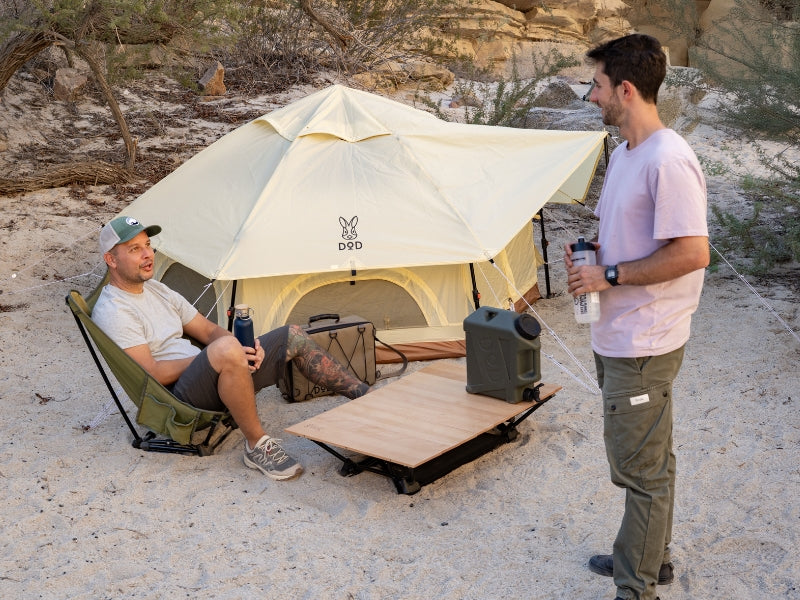The new Kyanary Table is an essential for comfortable camping. Made with the same adjustable leg technology used in DOD’s legendary Sugoi chair. The adjustable height allows you to use it when you’re sitting in a tall chair, a short chair, or reclining on the ground. The wood tabletop is durable and warm. Packs flat, sets up fast.