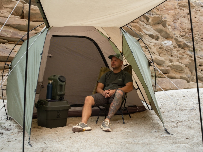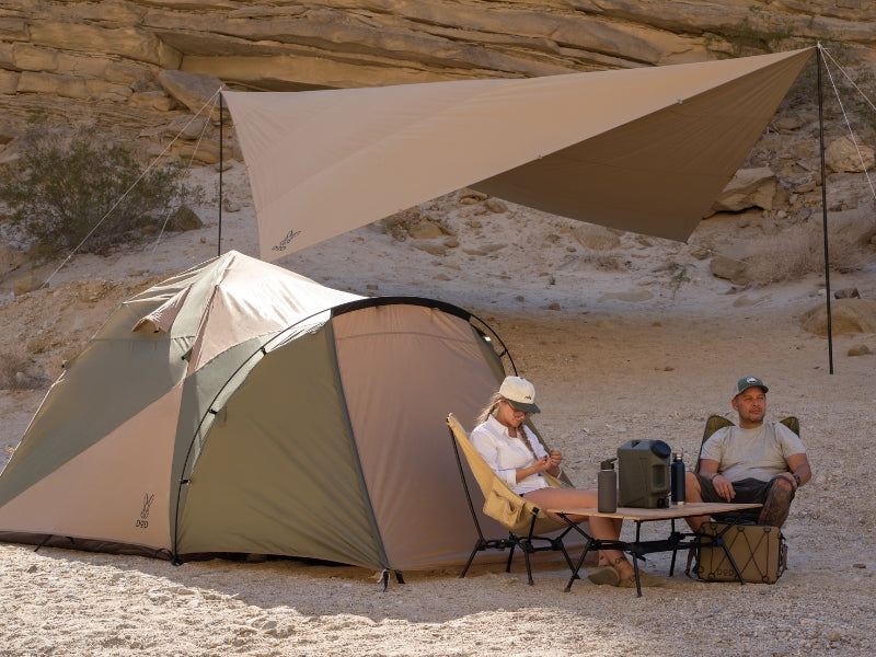 THE 1Pull Dome Tent combines ease of setup with spacious comfort, accommodating up to 3 people. Its 1Pull mechanism allows for hassle-free assembly. DOD’s muted color palette adds a touch of elegance to your camping experience. The tent includes a front chamber for additional space, making it perfect for both relaxation and storage. Large footprint awning extends living area and provides shade. (For a limited time, comes with Kiso Awning Poles).